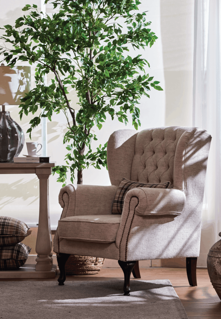 The Ashton Wing Chair combines classic design with cozy sophistication, featuring elegant upholstery buttons on its tufted backrest for a timeless charm. Upholstered in a soft, neutral fabric, it effortlessly complements any Farmhouse-inspired interior. Its graceful curves, rolled arms, and sturdy wooden legs provide both style and comfort, making it perfect for reading or relaxing.