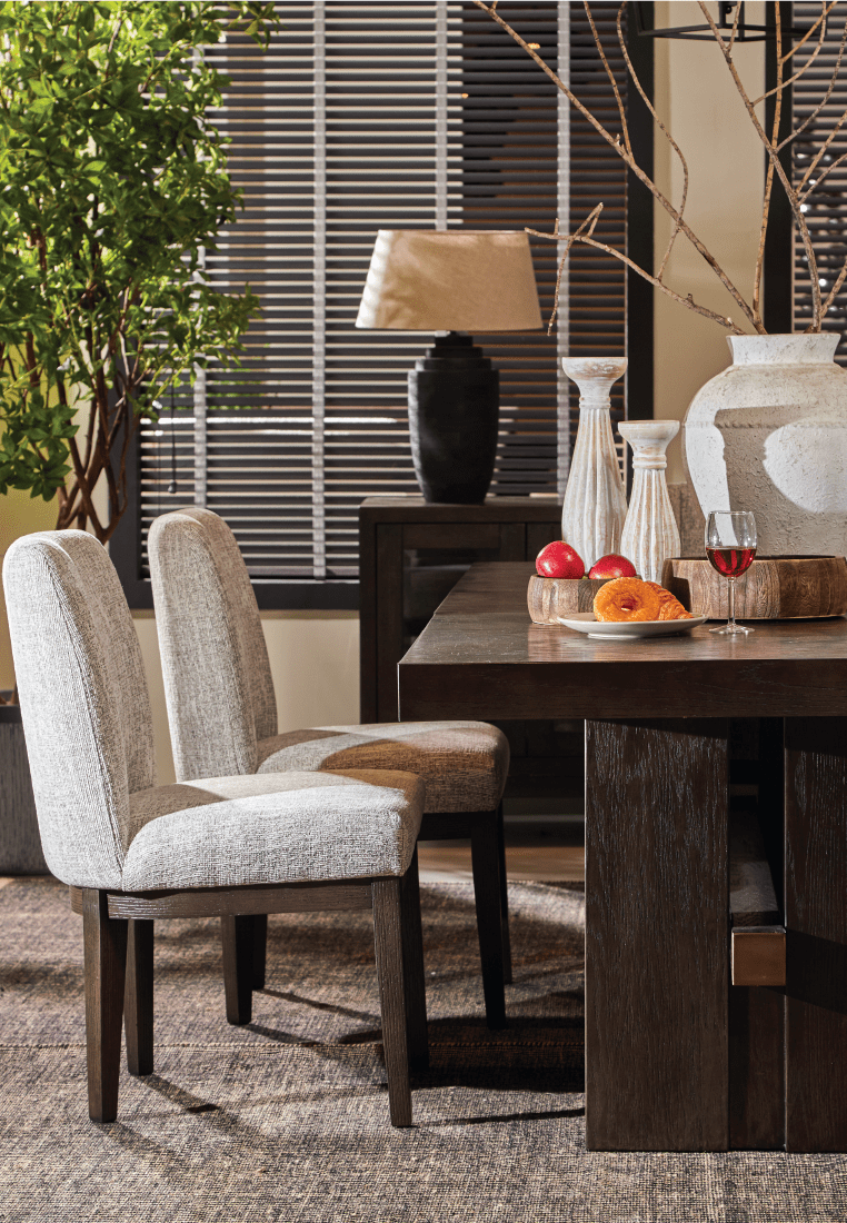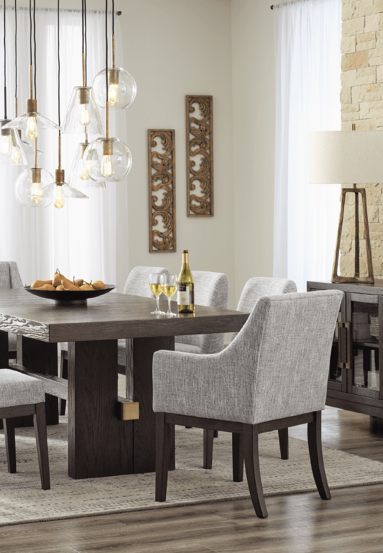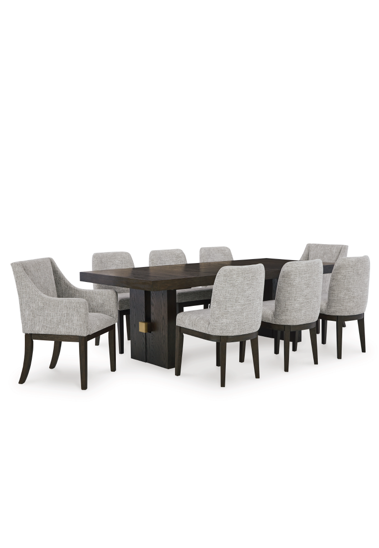 Dressed to thrill, the simply stunning Burkhaus Extendable Dining Set offers a high-design look at a down-to-earth price. Ultra sleek lines are accentuated with a dark waxy brown oak-tone finish that’s so easy on the eyes. Clean-lined and modern, the double pedestal base and thick edge tabletop showcase quality craftsmanship and attention to detail. Whether you're hosting family meals or holiday entertaining, it has a timeless look that’s made to last.