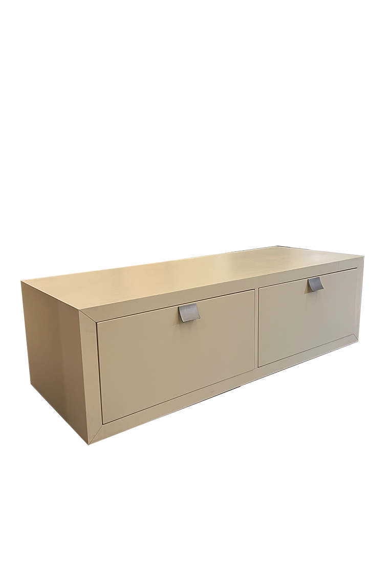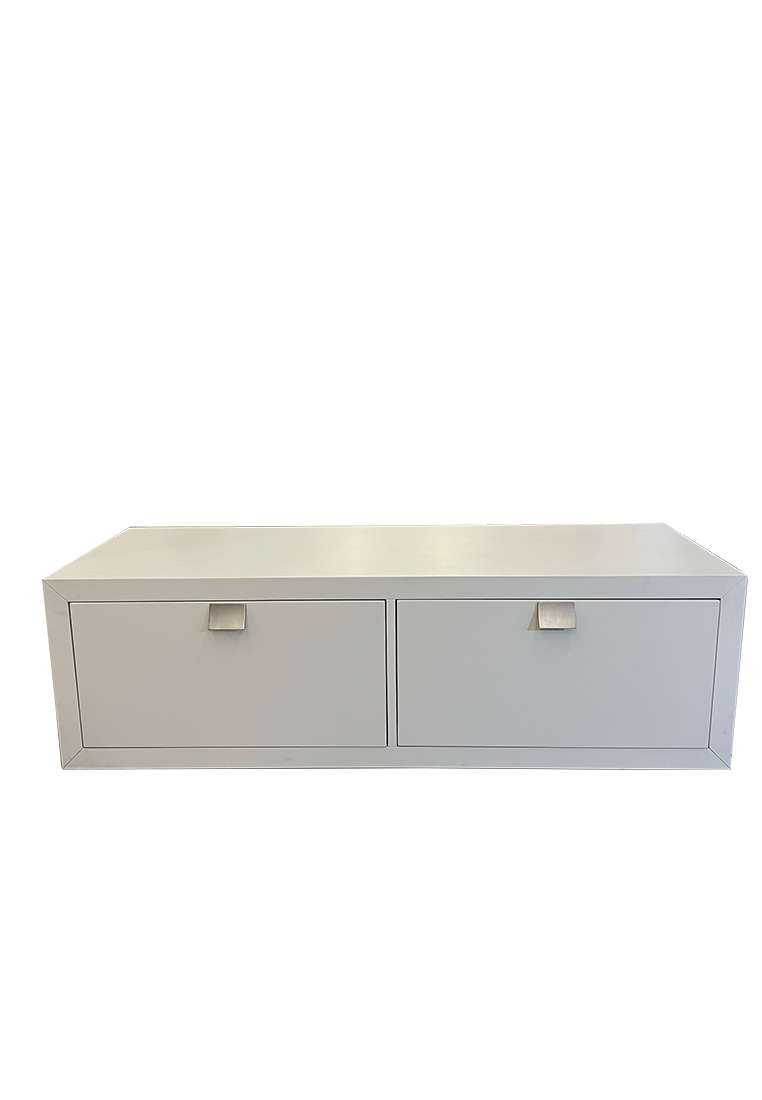 The Flanigan TV Cabinet features a sleek, contemporary design with a clean, white frame and strong, bold profile. Two brushed metal handles reveal spacious storage compartments. It's minimalistic aesthetic makes it a versatile addition to both contemporary and classic bedroom interiors.