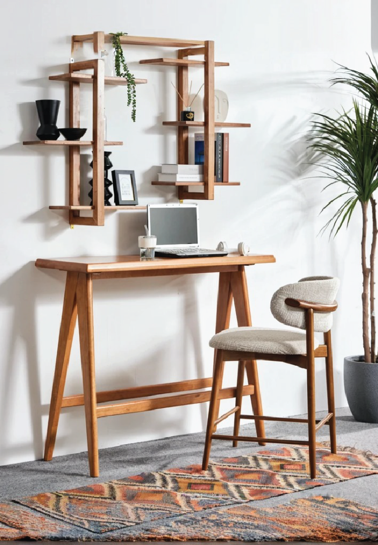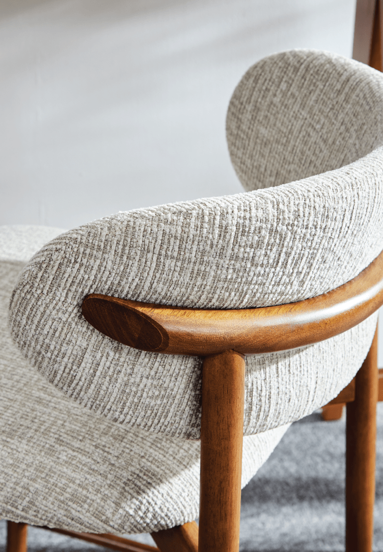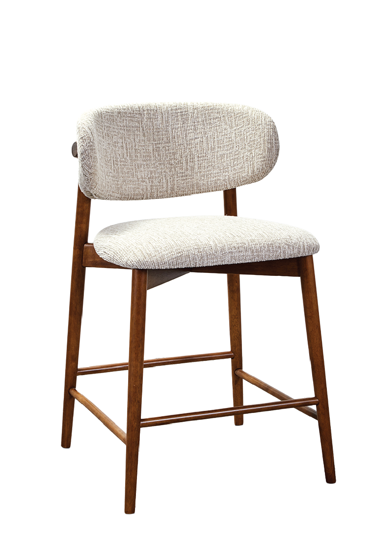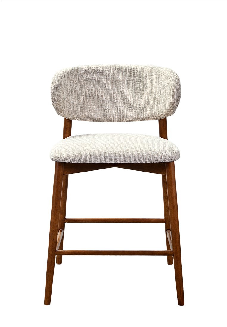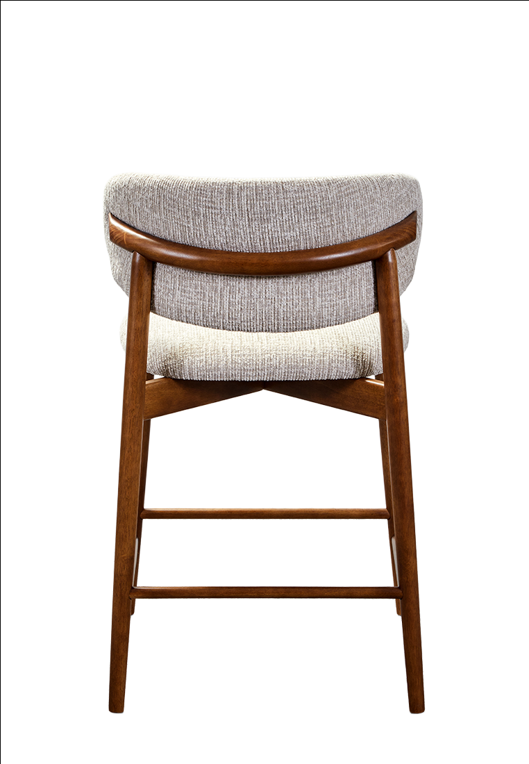The Halo Barstool features a beautifully curved backrest framed in warm wood, offering both comfort and style. Its textured upholstered seat and back provide a cozy, inviting feel, while the slender wooden legs lend a refined mid-century charm. Perfect for kitchen counters or bar spaces, it brings an elegant balance of softness and structure.