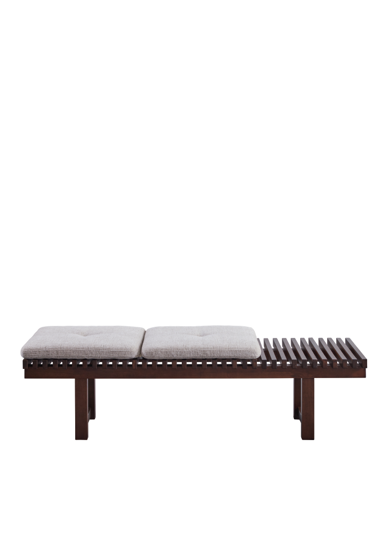 The Kaya Slated Bench is a darling, standing on conjoined feet, featuring narrow slats that creates a distinct appearance. The Kaya Slated Bench invites you to unwind. Whether indoors or outdoors, this bench seamlessly complements most decor styles. Comes with two upholstered seat cushions for a cozy touch.