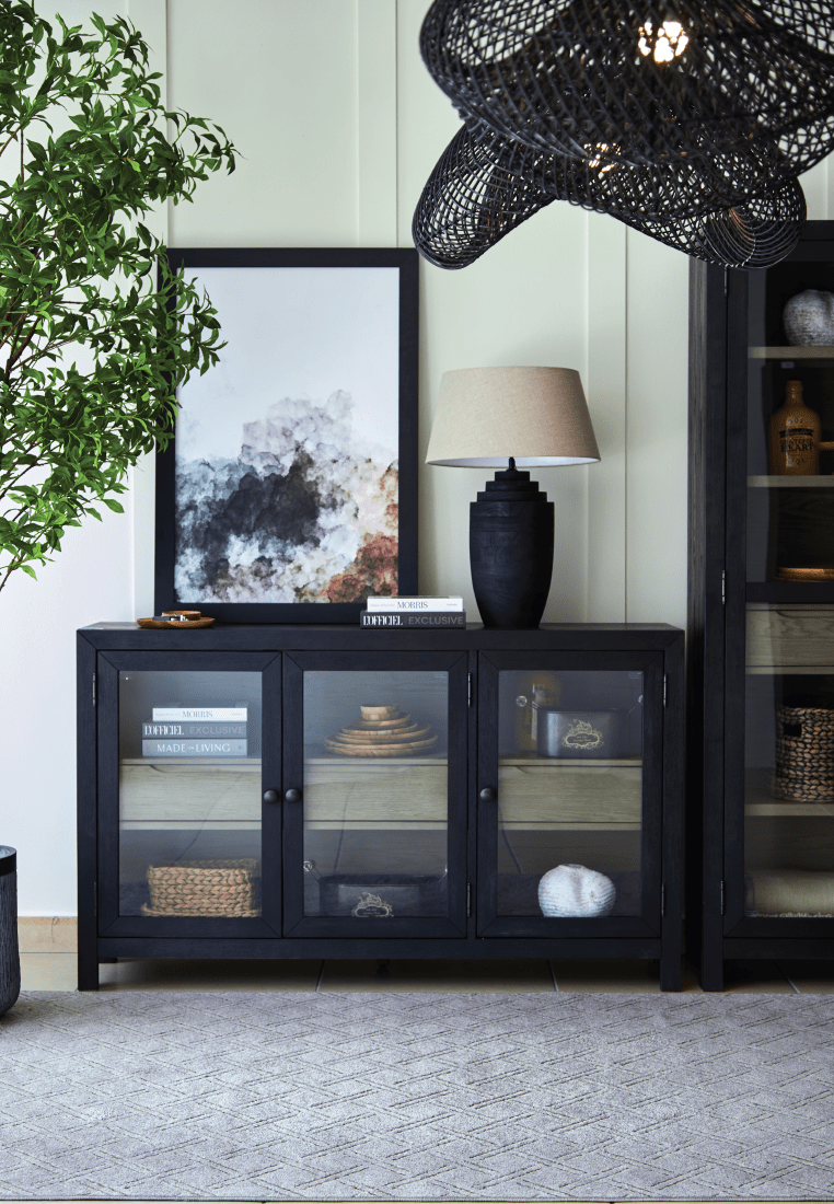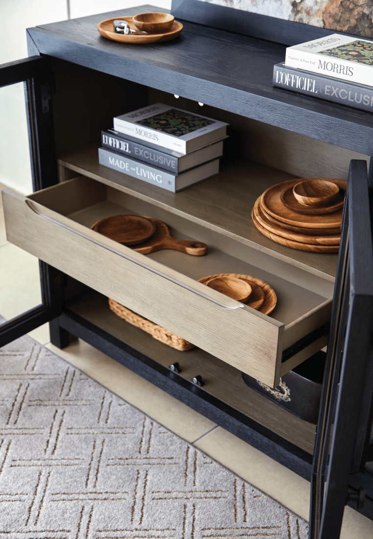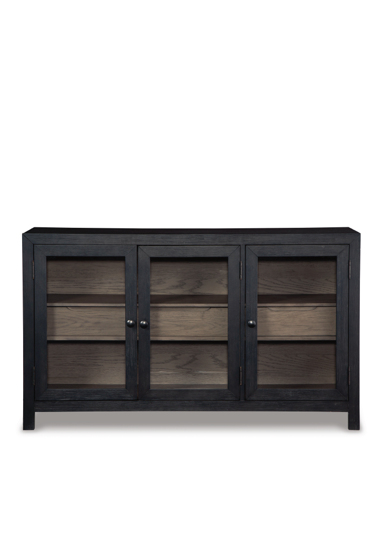 Add layers of form and function to your space with the Lenston accent cabinet. It's draped in a black finish on the outside and a warm gray finish inside, for a classic look that seamlessly transitions from casual to modern styles.