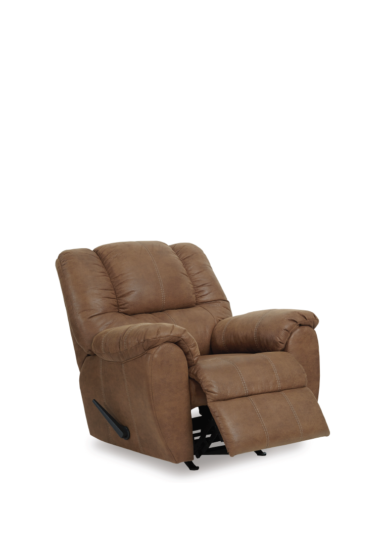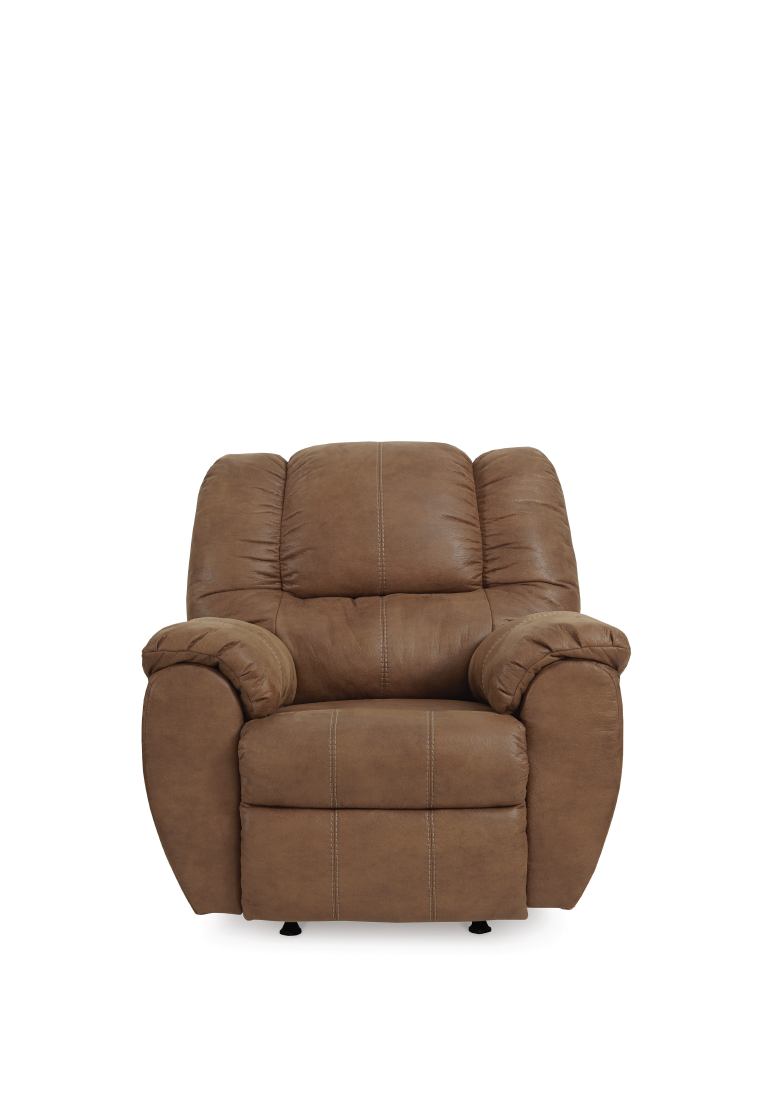 Rock the cool look of leather and the warm feel of fabric with this rocker recliner. Sporting sumptuously thick cushioning, fashion-forward jumbo stitching and a richly tailored aesthetic, this smartly priced recliner with gentle rocking motion is a bestseller for good reason.