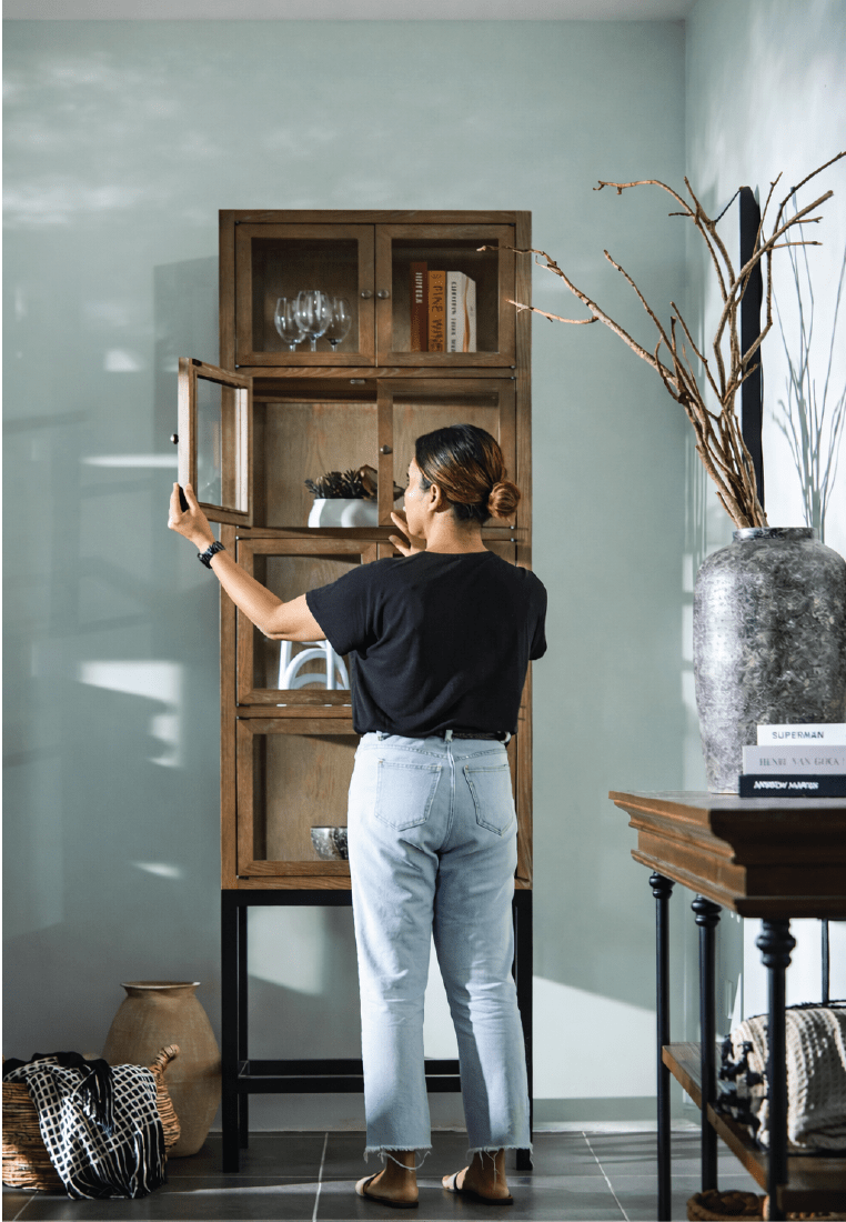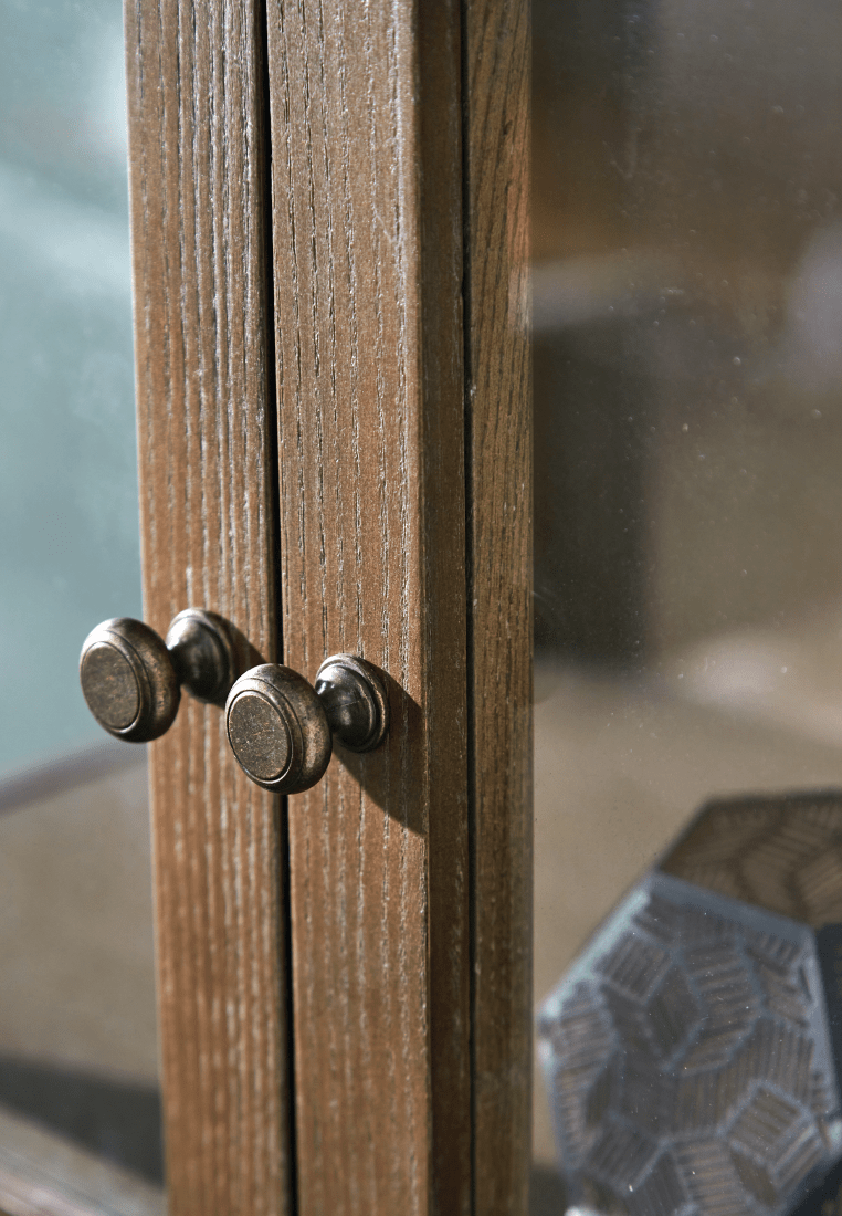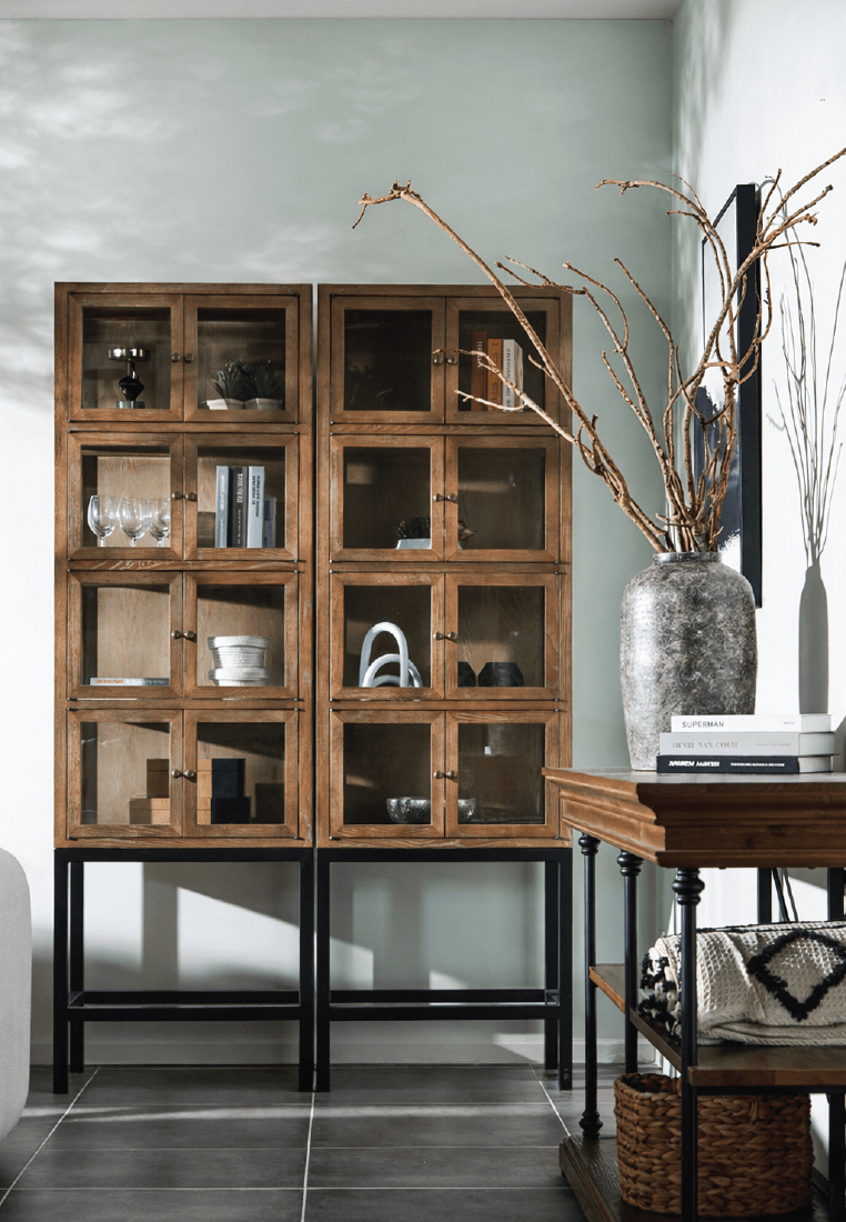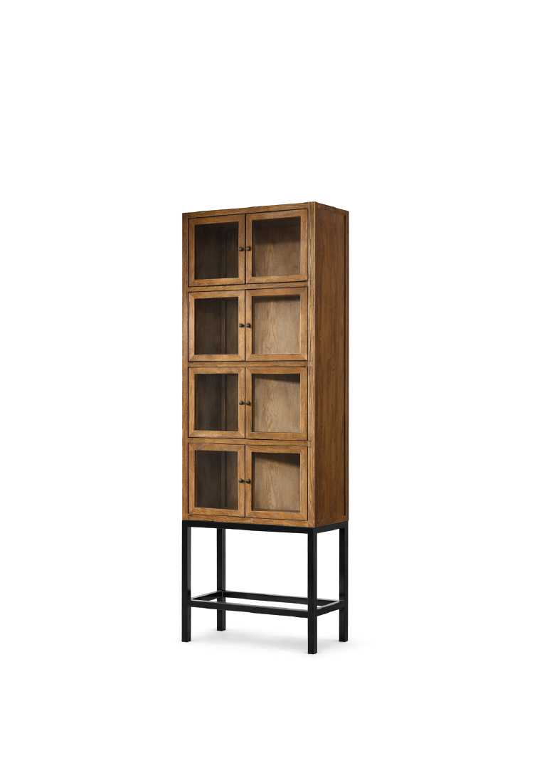 The Nessa Cabinet is a smart vertical storage piece, designed with tall, narrow proportions that fit beautifully in tighter corners and compact spaces. Its distressed wood finish brings a lived-in warmth, while the industrial-style steel legs add a crisp, modern edge that keeps the whole look light and elevated.