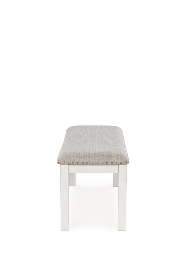 The Robbinsdale dining bench is sure to impress come mealtime. With its antiqued white finish and light gray upholstery with nailhead trim, modern farmhouse-style dining has never been so fashionable. All that's missing is you and your family.