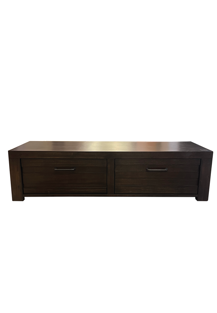 The Ruff Hewn TV Cabinet sports a rustic, distressed wood design, with a hefty frame and bold profile lines. Brushed metal handles reveal discreet storage space, allowing the Ruff Hewn TV Cabinet to fulfill both form and function.