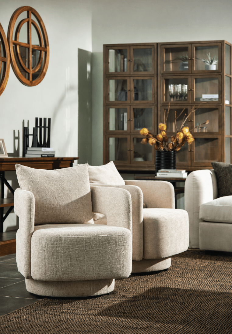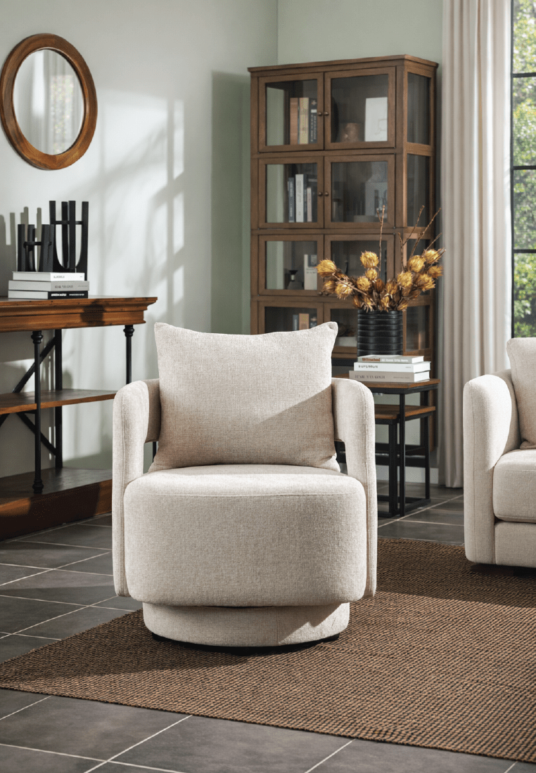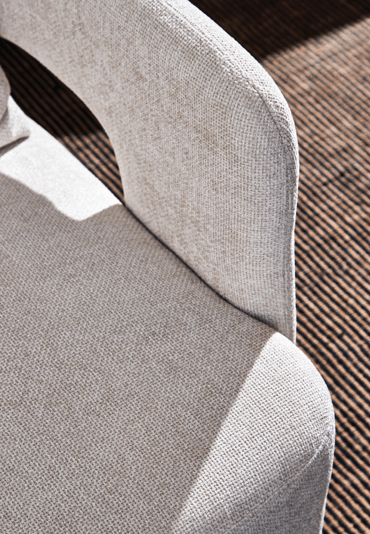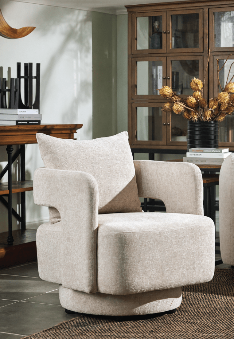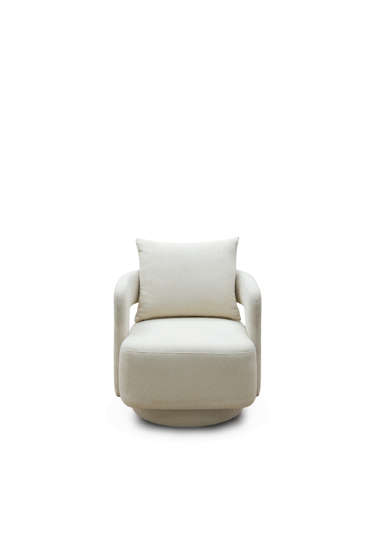 The Yuvira Swivel Armchair stands out with its sculptural form and modern silhouette. Its avantgarde design and rounded base create a bold and unique look, making the Yuvira Swivel Armchair a statement piece in any living space! With a smooth swivel function, the Yuvira combines elegance and practicality for effortless relaxation and style. Comes in two gorgeous fabric colors!